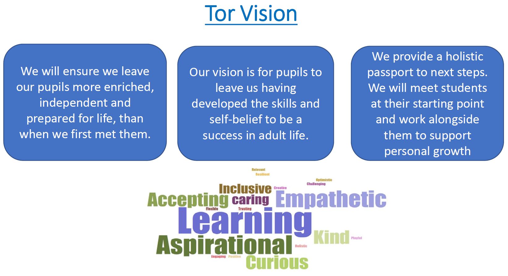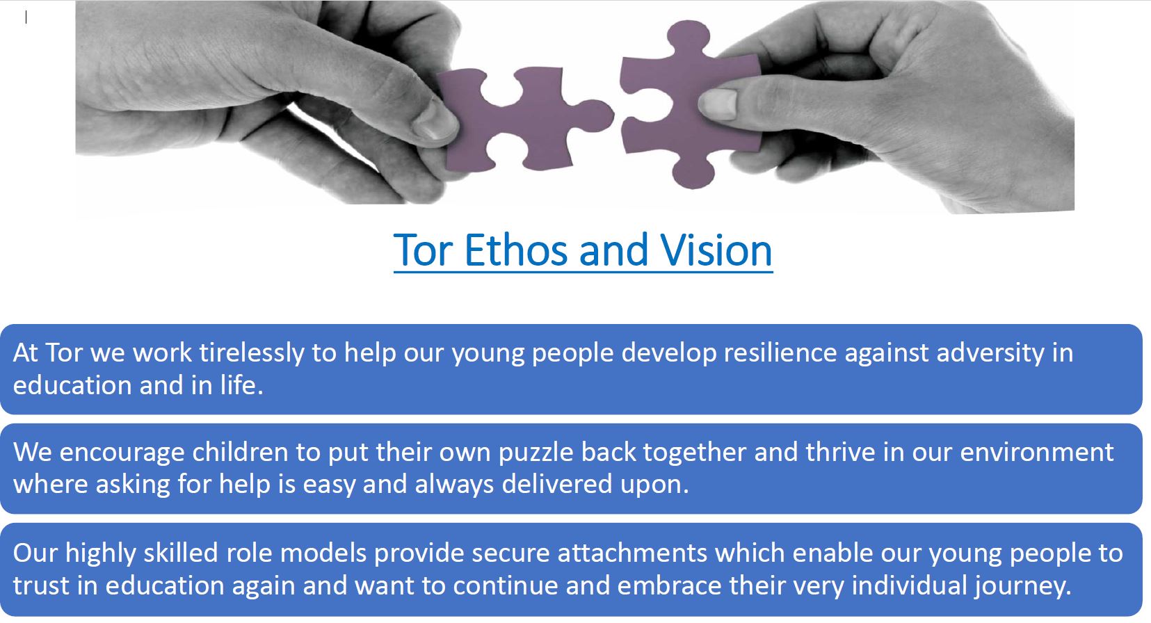 Research tells us that learning can only happen when children feel safe and secure. Tor is built on relationships and we work in a way that builds on this. It is only when the relationship is there, that they will take risks and open themselves up to new challenges. This can be difficult for children whose early life has been impacted by trauma. We believe that there is far more to education than just looking at exam results as the one simple metric for success – we want to grow inquisitive minds and show our young people how their subject knowledge explains the world around them as well as giving them self-belief.